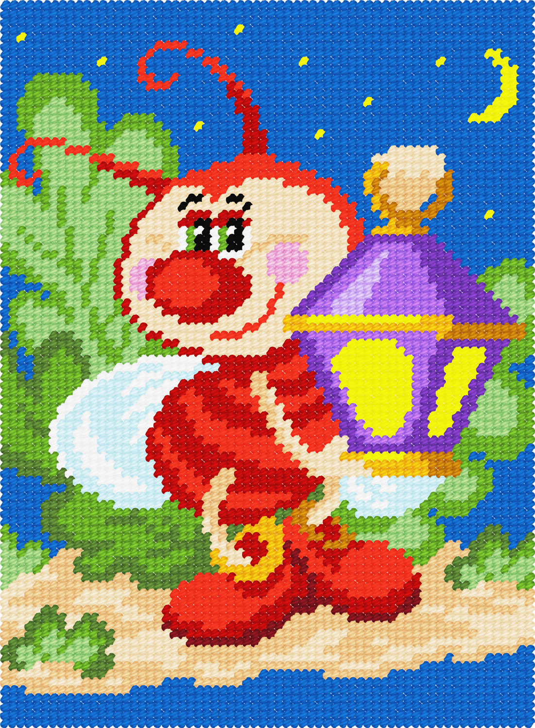 В наборі вже все необхідне: жорстка канва (страмін), на якій вже надруковано кольорову схему, яскава акрилова пряжа потрібних кольорів, спеціальна голка, інструкція.